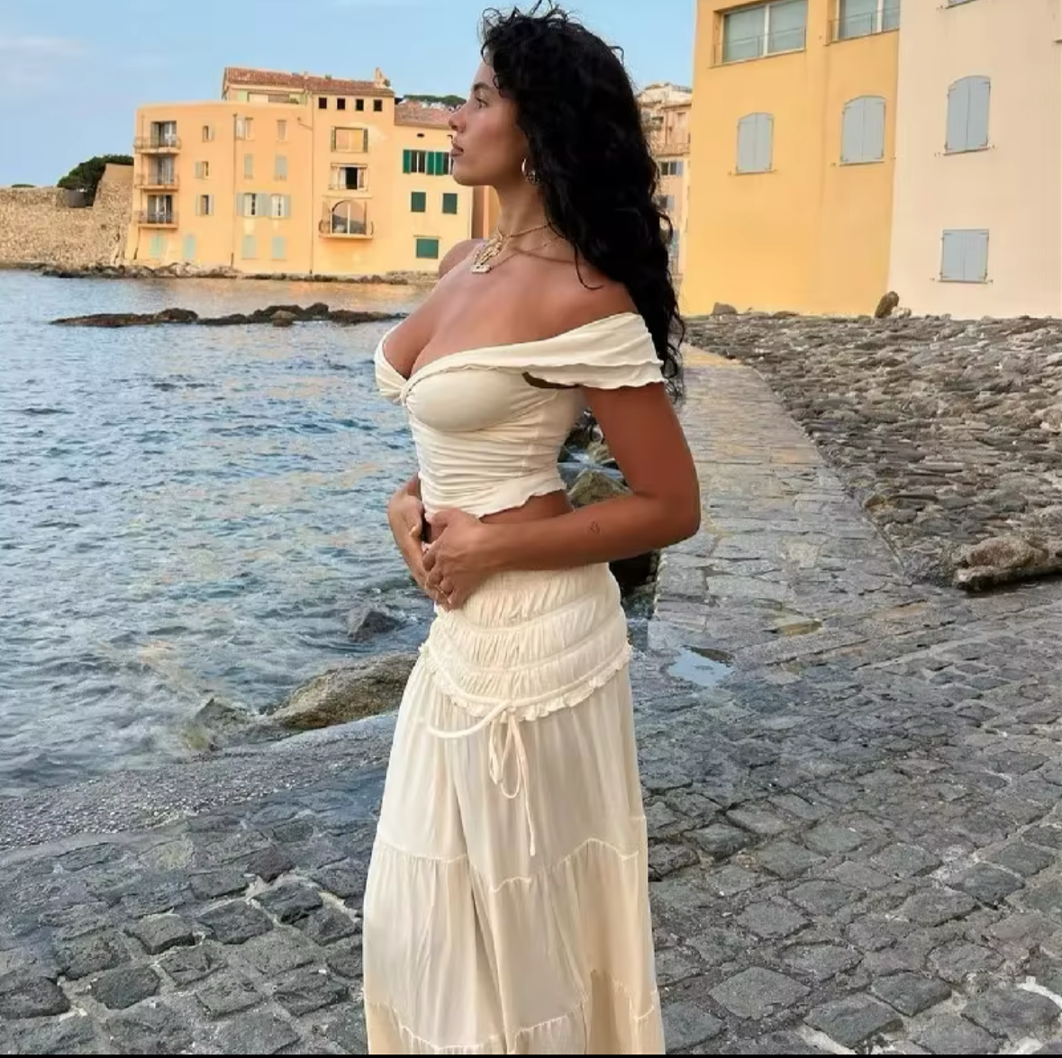This airy two-piece perfectly combines romance and style! The off-shoulder top with playful ruffles flatters the figure, while the flowing maxi skirt creates a dreamy, feminine look. Perfect for summer, beach holidays, or elegant occasions.