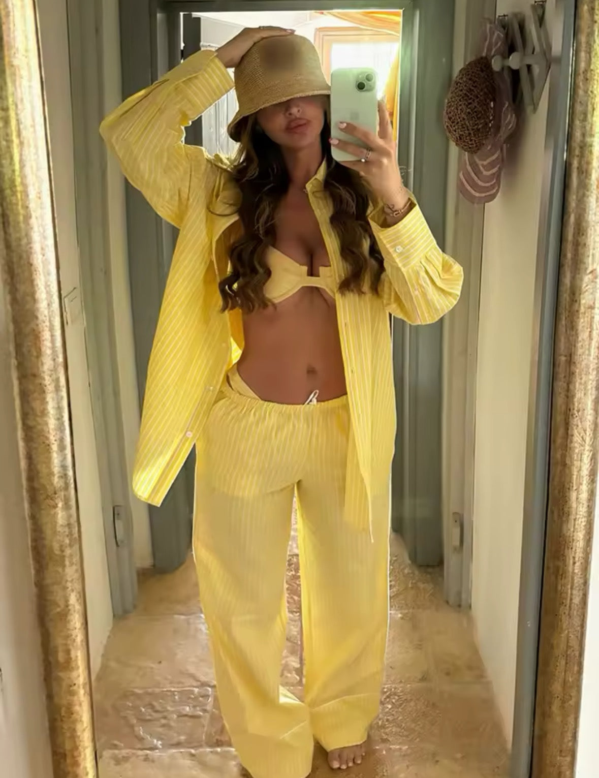 Dieses luftige Zweiteiler-Outfit bringt sommerliche Leichtigkeit in deine Garderobe. Ob als Loungewear, Travel Look oder minimalistisches Streetstyle-Statement – der lockere Schnitt, die atmungsaktive Qualität und das frische Streifendesign machen dieses Set zum Everyday Essential.